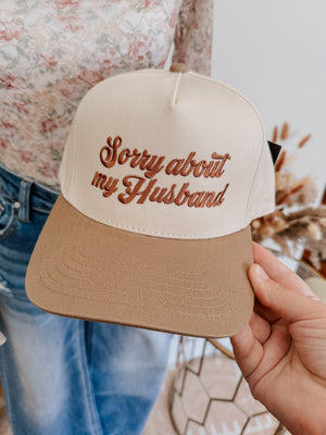 Sorry About My Husband Beige Embroidered Adjustable Snap Back Trucker Hat