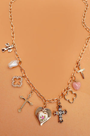 The Charm Necklace Clover, Cross, Porcelain Flower is a delicate and meaningful accessory that blends faith, luck, and beauty in one elegant design. Featuring a lucky clover, a timeless cross, and a finely crafted porcelain flower, this necklace offers a vintage inspired charm with a modern twist.
