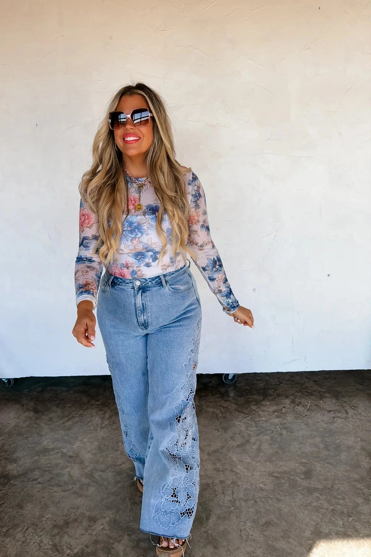 English Blue Floral Long Sleeve Mesh Top